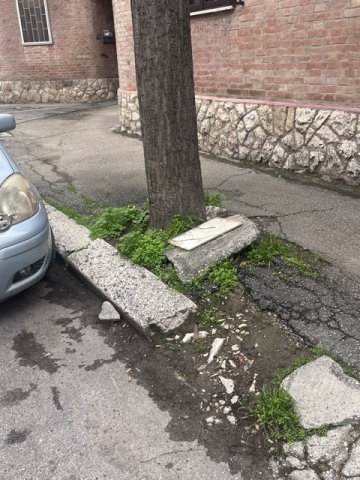 Buongiorno, con la presente segnalo una situazione di forte degrado del marciapiede dovuta alla presenza di alberi le cui radici hanno sollevato e danneggiato la pavimentazione. Il tratto risulta particolarmente dissestato, con lastre in cemento rotte e dislivelli evidenti che rendono difficoltoso e pericoloso il passaggio pedonale. La criticità è ancora più rilevante quando si scende dalle auto parcheggiate lungo la strada, con un concreto rischio di inciampo o caduta. Si tratta di una situazione che può rappresentare un pericolo per la pubblica incolumità, soprattutto per anziani o persone con difficoltà motorie. Si chiede cortesemente un intervento di verifica e la messa in sicurezza del marciapiede.