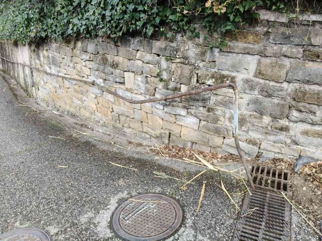 il corrimano non è più fissato al muro ed è pericolante in mezzo alla carreggiata, probabilmente danneggiato da qualche mezzo .