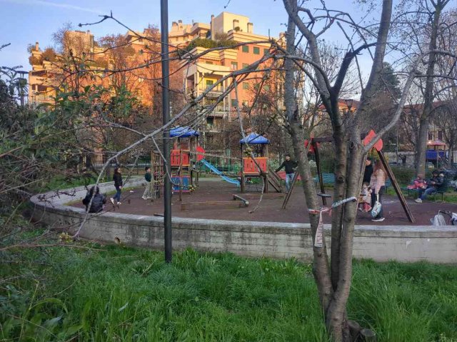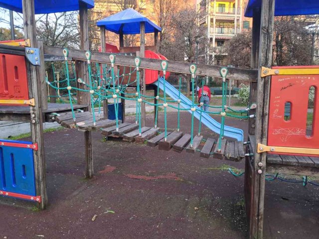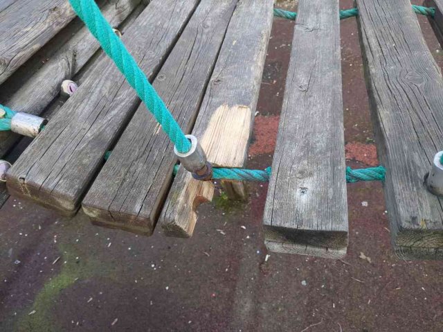 Come si vede in foto, nei giochi del Giardino Don Ghinelli c'è una passerella danneggiata. È pericolosa. grazie.