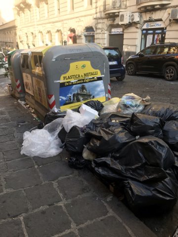 Segnalo campana gialla della plastica piena con quantità di sacchi all'esterno che ormai invadono quasi il marciapiede e l'ingresso di un palazzo